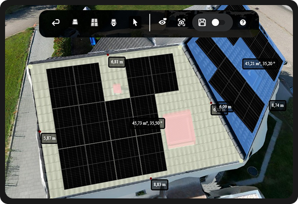 Rendera creates georeferenced 3D roof models that allow precise calculation of slope, azimuth, surface area, and complex geometries. When GPS-enabled drone imagery is used, accuracy is typically within a few centimeters. Non-georeferenced inputs such as phone images are also supported, but they provide only relative measurements without a guaranteed scale.